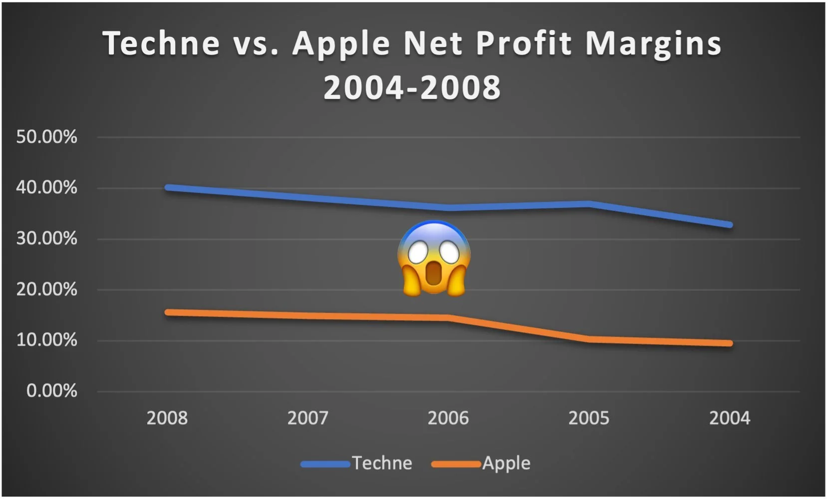 71/365: we often hear about "selling picks and shovels in a gold rush" but it's hard to understand just how different those businesses can be if done right. Here's a chart of $TECH puking net income vs. $AAPL from 2004-2008.